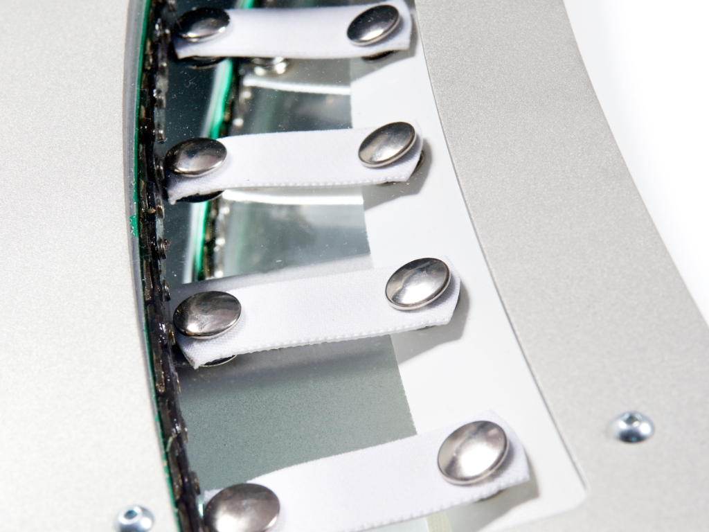 Durch die Verwendung von Druckknöpfen können beschädigte Elastikgewebestreifen nun simpel ersetzt werden. Dies führt zu einer deutlichen Kostenersparnis und längeren Standzeit der Kurvenbänder, da der komplette Wechsel des Bandes nun entfällt.