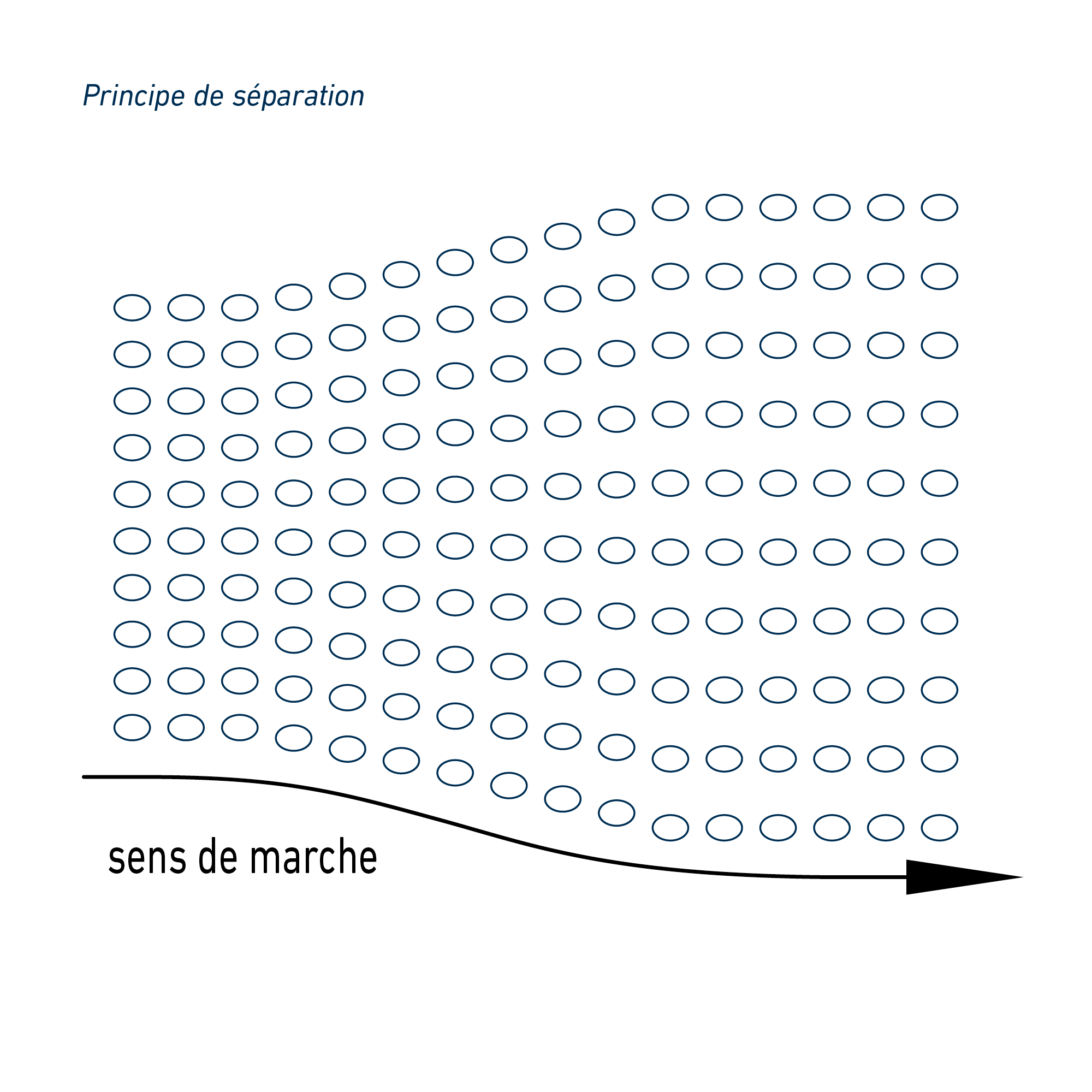 Lorsqu'il s'agit d'écarter ou de rapprocher des produits, nos bandes d'écartement entrent en jeu. La plage d'écartement maximale est de 30 %. Il est ainsi possible d'augmenter ou de réduire l'écart entre les produits pendant le transport. Un exemple est l'écartement des barres protéinées avant l'enrobage de chocolat, afin d'éviter que les marchandises ne collent les unes aux autres. Cela vaut même pour les plus petits articles ou les produits en vrac. Un autre avantage est qu'il n'est pas nécessaire de changer d'équipement lors du changement de produit.